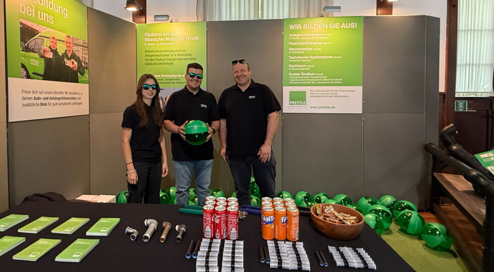 Am Prestle-Messestand werden durch unser Prestle-Ausbildungsteam die Berufe des Anlagenmechanikers für Sanitär-, Heizungs- und Klimatechnik (m/w), Flaschner (m/w), Kaufmann für Büromanagement (m/w), der technische Systemplaner (m/w) und der duale Studiengang techn. Gebäudeausrüstung/Gebäudeklimatik vorgestellt.